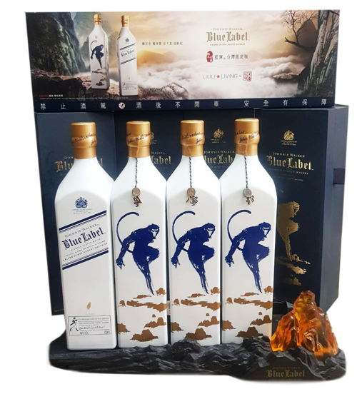 藍牌猴年限量整組 售價$99,000/套 單瓶售價$30,000(缺貨中) JOHNNIE WALKER藍牌威士忌《猴年珍藏》台灣限定版, 結合臻稀白釉藍墨瓶身,呈現中國青花瓷的絕代典雅。猴王威震山河之勢以中式水墨筆法 盎然躍現,環繞方形瓶身,四只酒瓶一字排開的磅礡氣勢,成功演繹JOHNNIE WALKER 藍牌威士忌的尊榮風範.